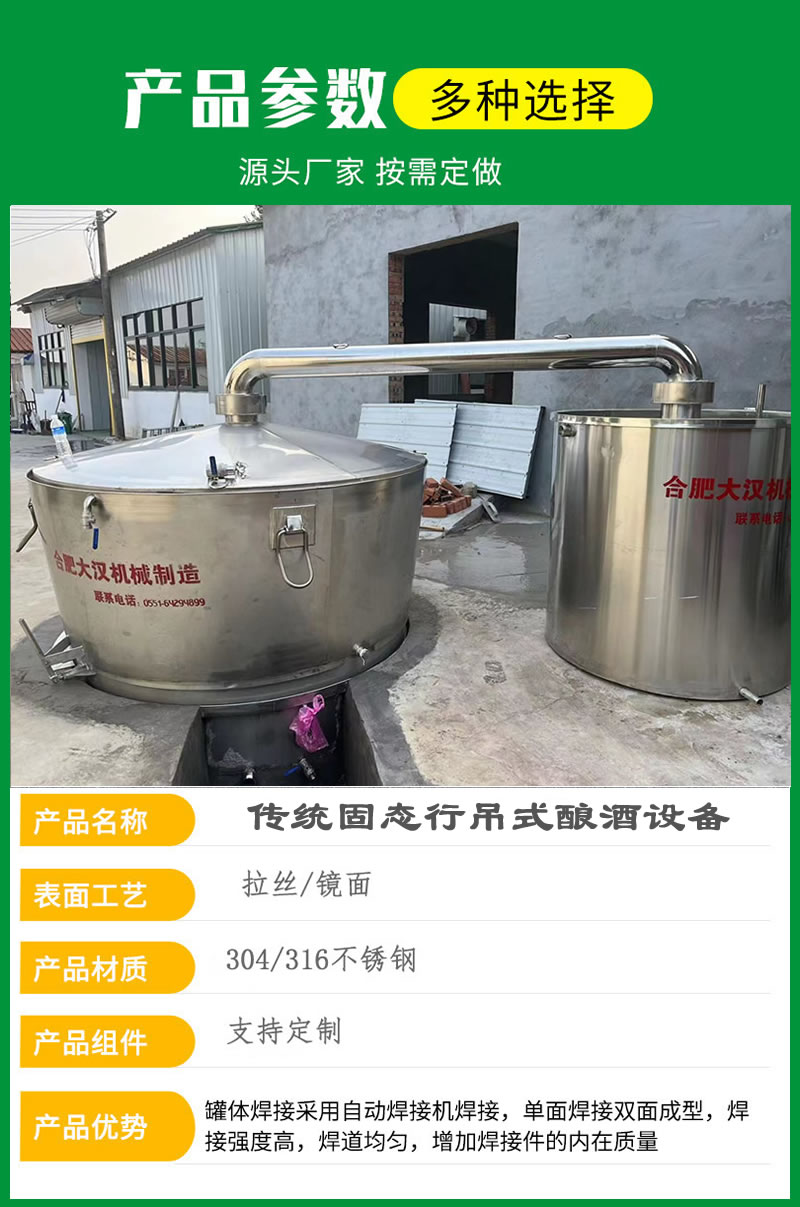 合肥大汉专业生产农村家庭小型酿酒设备 甑桶:由桶身、甑盖、底锅组成,底锅内放入黄水酒尾等用来提供蒸酒的蒸汽,底锅上方为锥台形桶身,桶身和底锅中间隔有筛板。酒醅被均匀填入桶内的筛板之上,在底锅蒸汽作用下,甑内酒醅温度不断升高,以浓缩提取酒精和香气成分