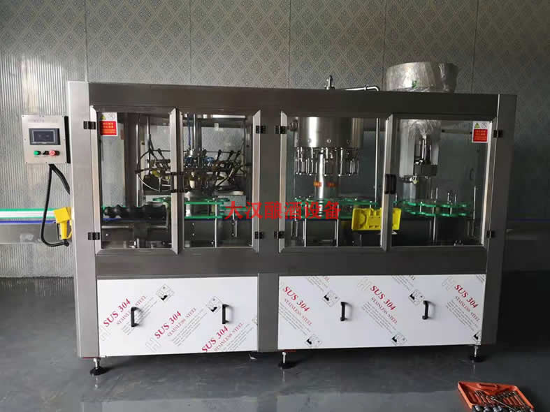 产品介绍该机是在技术质量过硬的单机基础上,将12头全自动翻转式冲瓶机、12头全自动等位式灌装机(前部配有单头抽真空充氮气装置)与单头全自动打塞机结合在一起的三机联体设备,使设备间的动力一致,进出瓶平稳一致,中间环节无挤瓶堆瓶现象,不易倒瓶、短路径、故障率低、效率高、省人省电,解决了设备间传动费工费时缺陷,它适用于不含气体的如各种果酒、保健酒、饮料和调味品等液体的灌装,特别适用于容器比较高液位比较准的灌装。主要特点A、冲瓶机特点: (1)采用弹性强力机械手抓瓶、翻瓶、冲瓶、空瓶、翻转复位、出瓶等工序,实现了全自动化生产。 (2)机械手冲压件、铸件材料均采用国标优质304/316材质,保证了材料的耐腐蚀性。 (3)连续跟踪式冲瓶效率高、冲洗效果稳定可靠。 (4)机械手具有抓瓶定位准确,翻转活动自如等特点,冲水阀密封性能好,冲瓶力度大冲瓶对中性准等优点。 (5)进出瓶采用数控加工中心制作的导瓶螺杆及拨瓶轮,将瓶子准确导入进瓶导轨,解决了挤瓶、卡瓶、堵瓶、破瓶的难题。 (6)只需按动升降按扭及更换相应瓶径拨瓶轮后,即可更换不同瓶径,瓶高的瓶子。 B、灌装机特点: (1) 效率高:变频调速,生产能力最快可达150~170瓶/小时/阀。. C、打塞机主要特点: (1) 结构设计新颖、紧凑,工作可靠。维修方便,故障少,设备寿命长。 (2)自动化程度高,理塞、送塞、挤塞、打塞均自动连续进行,各项动作协调一致。 (3) 根据瓶型高度,调整打塞高度,适用瓶型高度范围广。 (4) 进瓶、压塞过程有过载保护,防止破瓶损机。不进瓶,不下塞,有效防止木塞的浪费。功能用途A、冲瓶机特点: (1)采用弹性强力机械手抓瓶、翻瓶、冲瓶、空瓶、翻转复位、出瓶等工序,实现了全自动化生产。 (2)机械手冲压件、铸件材料均采用国标优质304/316材质,保证了材料的耐腐蚀性。 (3)连续跟踪式冲瓶效率高、冲洗效果稳定可靠。 (4)机械手具有抓瓶定位准确,翻转活动自如等特点,冲水阀密封性能好,冲瓶力度大冲瓶对中性准等优点。 (5)进出瓶采用数控加工中心制作的导瓶螺杆及拨瓶轮,将瓶子准确导入进瓶导轨,解决了挤瓶、卡瓶、堵瓶、破瓶的难题。 (6)只需按动升降按扭及更换相应瓶径拨瓶轮后,即可更换不同瓶径,瓶高的瓶子。 B、灌装机特点: (1) 效率高:变频调速,生产能力最快可达150~170瓶/小时/阀。. C、打塞机主要特点: (1) 结构设计新颖、紧凑,工作可靠。维修方便,故障少,设备寿命长。 (2)自动化程度高,理塞、送塞、挤塞、打塞均自动连续进行,各项动作协调一致。 (3) 根据瓶型高度,调整打塞高度,适用瓶型高度范围广。 (4) 进瓶、压塞过程有过载保护,防止破瓶损机。不进瓶,不下塞,有效防止木塞的浪费。其他说明公司主要产品有:白酒灌装生产成套设备、果酒灌装生产成套设备,联动控制系统、同步机械传递系统、无压力输送系统、立体传输系统等。 鹏程机械竭诚与各方朋友建立友好合作关系,共同发展,共创大业!